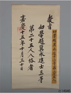 생원과는 논술, 진사과는 문예장착 전형이었다. 둘 중 자신있는 과목을 치르면 되었고 합격자는 생원, 진사 각각 100명씩밖에 되지않았다. 이후 합격하면 아래의 백패라는 합격증을 받았다.