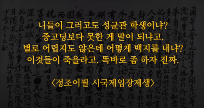 성균관은 조선 중기 영정조 때 전성기를 달렸다. 특히 정조는 본인 자체가 똑똑하여 성균관의 유생을 엄청나게 쪼았다. 하루는 정조가 성균관 특별 시험을 치르면서 문제를 냈는데 이 문제가 어려웠는지 답안이 개판이거나 백지 제출한 사람들이 있었다. 이를 본 정조대왕은 화가 나 유생들에게 이러한 경고장을 날린다.