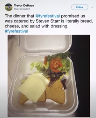프라이빗 숙소는 커녕 젖은 매트리스만 방치되어있고 산해진미는 커녕 끼니로도 부족한 위의 도시락만 나왔다. 화가 난 참가자들은 주최자를 찾았지만 이들은 이미 도망간 상태였다.
